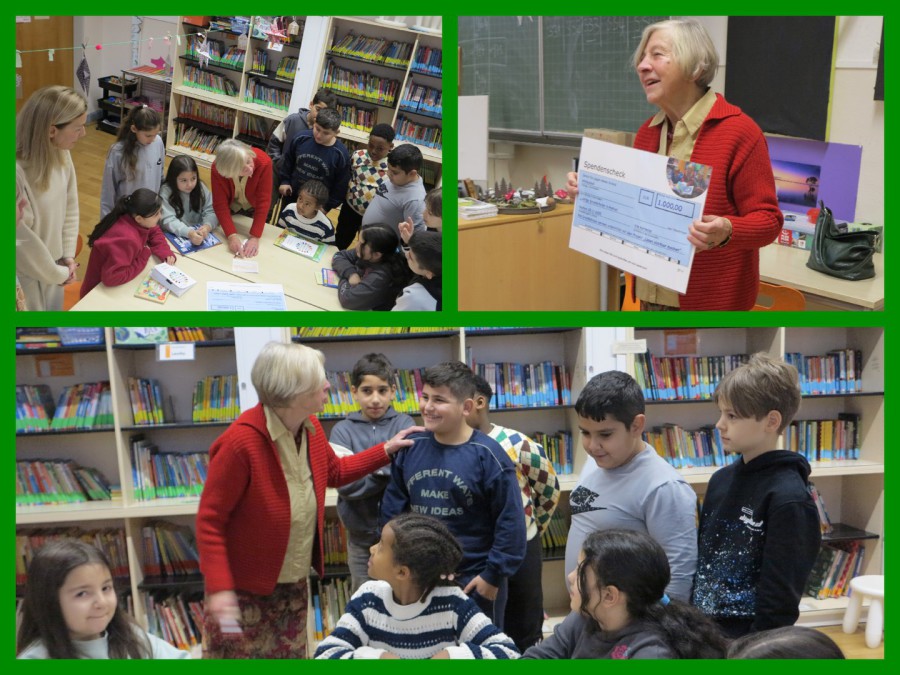 Diese Idee hat Frau Ketteniß aus Aachen. Durch verschiedene Aktionen versucht sie, Kindern das Lesen näher zu bringen. Als ehemalige Lehrerin weiß sie, wie wichtig das Lesen für die Entwicklung von jungen Menschen ist. Am bundesweiten Vorlesetag war sie in unserer Schule. Die Kinder der 4d und Frau Schnakenberg haben sie mit einem kleinen Programm in unserer Bücherei empfangen. Ebenfalls anwesend waren Frau Quadflieg (Vorsitzende des Fördervereins), Frau Al Houmadi (Büchereimutter) und unsere Schulleitung Frau Cordes. Frau Ketteniß spendete unserer Schule 1000 Euro, die wir nun für spannende, lustige, gruselige oder interessante Bücher ausgeben werden.