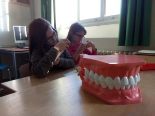 Es gab eine Station, da konnten wir ein Spiel spielen und Fragen beantworten. Zum Schluss haben wir einen Kaugummi bekommen. Bei einer anderen Station haben wir selber Zahnpasta hergestellt. Die Frau von der Zahnprophylaxe hat uns dabei geholfen. Wir haben auch Plastikzähne geputzt. An einem anderen Tisch haben wir eine eigene Zahnpasta gemalt und verziert. Woanders gab es zwei Gläser mit Wasser. In jedem Glas war ein Ei. Das eine Ei war mit Fluorid eingeschmiert und das andere nicht. Das Ei mit Fluorid hat nicht geschäumt und ist ganz geblieben. Nachdem wir alles gemacht haben, sind wir in die Klasse zurückgegangen. Wir durften uns eine neue Zahnbürste aussuchen und haben Zähne geputzt.